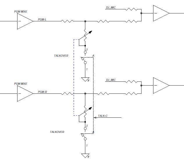 Túlzás ebbe váltó kapcsolót - főleg relét - belekombinálni. Egy Omnitronic rajzból ollóztam, nézz át pár gyári keverő rajzot hátha valamelyik megtetszik. Amit ki lehet találni ebben a témában az szerintem már kitalálták.