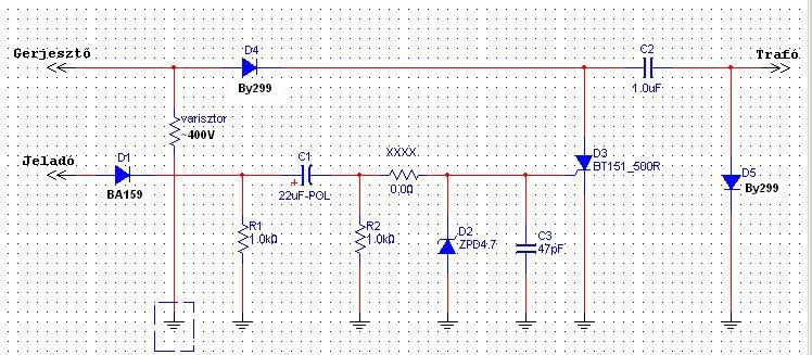 Ha a felső csatlakozáson polaritásváltás van, akkor viszont a negatív pont a dióda miatt (ami a felsőre csatlakozik katóddal) lekerül a tirisztor katódra, ami viszont össze van kötve a trafó primerrel is. A GND pont viszont ennél egy diódán eső feszültséggel pozitívabb lesz, és így be tudja gyújtani a tirisztort, (legalábbis azt a típust). A helyedbe én sorbakötnék kettő, három diódát, és egy soros áramkorlátozó ellenállással vezérelném a tirisztor kapuját, így sokkal többféle tirisztor is alkalmas lehet.