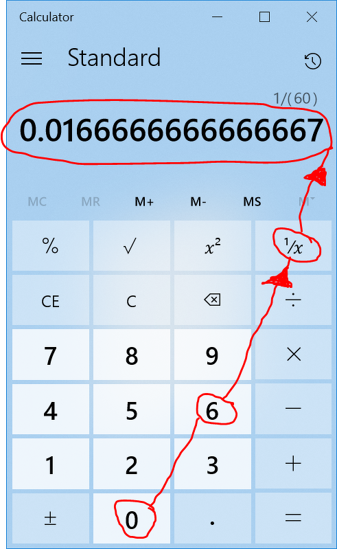 Vagy pedig vasútállomásról, vagy váróteremből levitézlett egy vagy két oldalas óra. Ezek eredetileg központi perc alapú időalapról működnek. Nincs bennük semmi IC, csak valami tekercs. Percenként lépnek egyet, ezért kell az említett frekvencia, a 0,01666..... Hz. A tizedesjegyek száma attól függ, hány digites a számológép. Pontosabban 1/60 Hz.