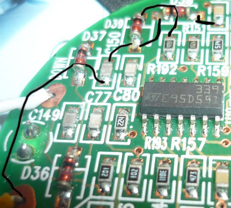 Mellékeltem egy képet a vezérlőn található IC-ről, illetve visszavezettem a hangerőszabályzók közül a hangosítást. Feketével jelöltem a sávot, ami két diódán is átmegy, majd egy kondenzátoron keresztül kerül kivezetésre.