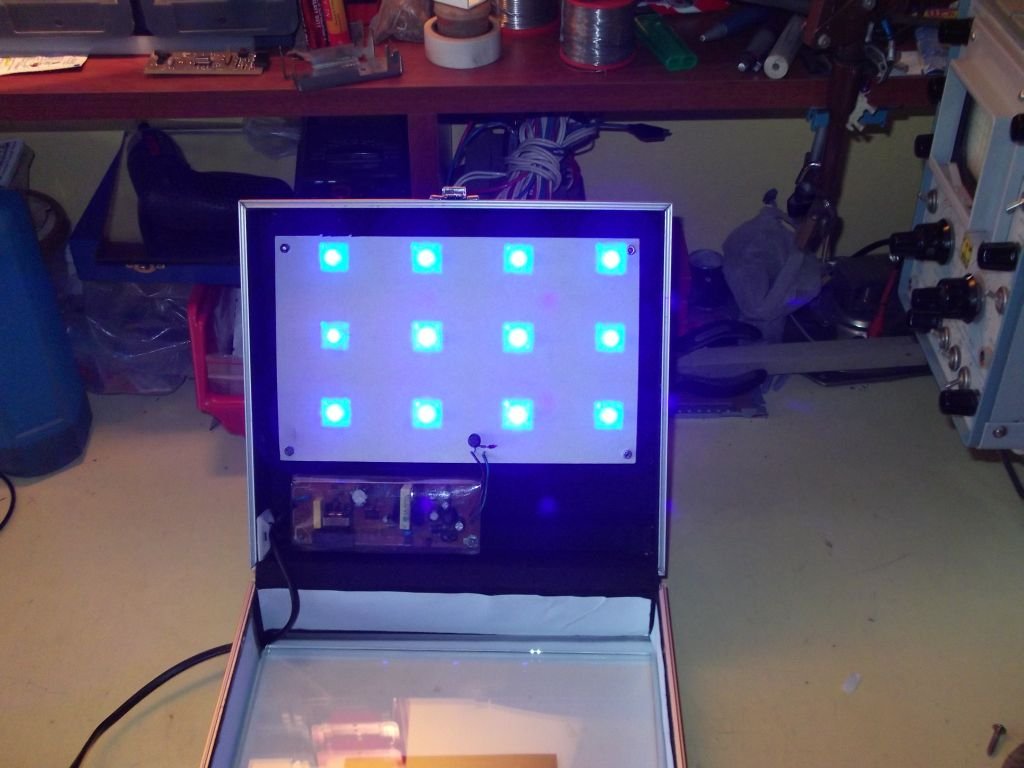Átépítettem a levilágítómat.Az üveg túl közel volt a LED-ekhez.Most a fedélbe vannak beépítve,és a táska aljában van a nyák a filmmel.Sajnos a nyomtatóm tonerje kifogyóban van,így a maszk igencsak átlátszó.De egy perc levilágítással,dry fóliával sikerült egy tűrhető nyákot fotóznom.Ki nem marattam,mert a kapcsolósor mérete nem passzol.