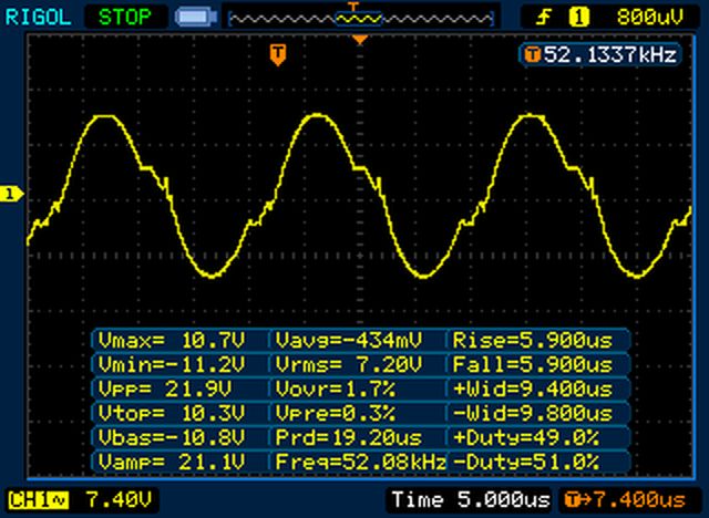 A Skory tápja rezonáns táp. Fölösleges a kimenetre egy LC szűrő. A tápot kell rendesen beállítani, hogy rezonáns legyen tényleg, és az áram szép szinuszos legyen. Akkor zavarmentes lesz a táp. Dobok be egy képet az enyém áramáról. 100W körül volt a terhelés, ha jól emlékszek.