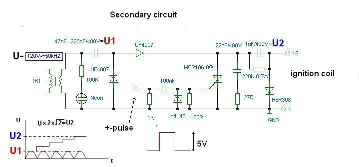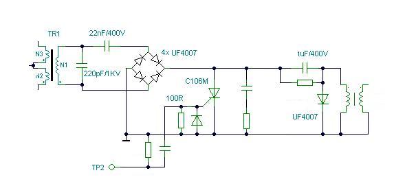 Ha megengeditek adok két ötletet hogy, hogy illik tölteni egy nagyfrekvenciás inverterről egy kondenzátort , hogy az áramfelvétel kicsi maradjon. Mind a két kapcsolás lépcsőzetes feltöltést biztosít csak az egyik feszültség duplázást is végre hajt. Ez az előnyösebb mert ennél nem kell vékony vezetékkel és sok menetszámmal megtekerni a szekunder tekercset. Elég csak fél menetszámmal , de igaz dupla olyan vezeték átmérőt kell használni. Én ezeket a szekunder áramkörökkel különböző gyújtás áramkörökben találkoztam ahol igazán rövid idő van csak a kondenzátor feltöltésére és mégis használják őket (ezek gyári gyújtások voltak). Nektek meg idő van bőven, ezért szerintem nálatok is beválnának. Amúgy ez egy hatásos védelem a tirisztor beragadás ellen is. Üdv nyemi