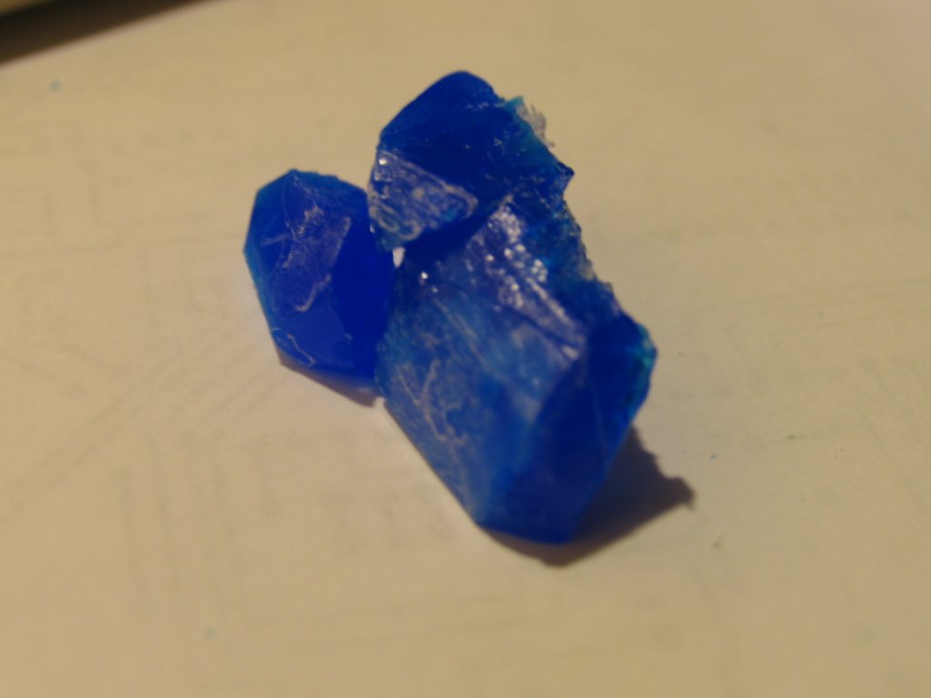 Igen, ez a perszulfátos maratóbol kristályosodott így ki. Sajnos melegvíz oldja, viszont ha nem éri nedvesség akkor nem olvad el. Ez már állt 5 órát a szobában és utána fotóztam le. Nem tudom mitől áll össze. A fagyott réteg tetejébe volt befagyva, illetve volt egy adag az akváriummelegítő gumiján, illetve a levegőztető csövön is. Ezekről könnyen lejött az aljából azonban egy kis melegvízzel fel kellett oldani a jeget, hogy ki tudjam bányászni őket. Élőben egész mélykék színe van, viszont gondolom, ha víz érné, akkor csak valami maró anyag lenne belőle, ezért nem merem eladni szobadísznek sem.