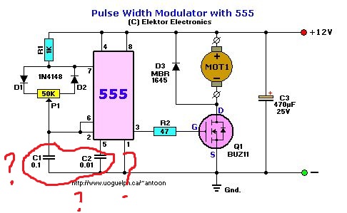 Ezek a kapcsolások azért szoktak működni! Az MBR diódádnak a középső lábát csak akkor vágd ki, ha magát a fejét használod mint közös katódot. A két szélső lábat kell közösíteni, az lesz a dióda anódja (a tű) és a középső lába a katód (a lap). A pozitív tápra kell kötnöd a középső lábat, a két szélsőt pedig a FET "Drain" lábára. Ha ennyire nem reagál a motor a poti forgatására, akkor próba képen tedd a következőt. Kösd ki a FET vezérlő lábát, a motort hagyd benne. Ha a motor eleve forog teljes fordulattal így is, akkor zárd rövidre a FET "G" és "S" lábát ( a két szélső lesz az), mire a motornak le kell állnia! Ha ezt nem teszi, akkor zárlatos a FET. Ha leáll, akkor pedig a "G" lábra adott kis pozitív impulzussal el kell, hogy induljon, és így is marad, mindaddig, amíg ismét le nem állítod az előző módon. Eddig volt a FET vizsgálat. Most jön a vezérlés. A potmétert ellenőrizd, hogy jó e, egyszerűen Ohm méréssel, minden lábát, vagyis a két szélét is, aztán azt, hogy a középső lába és valamelyik szélső között folyamatosan változik e az ellenállás, ha tekered. Ha rossz, esetleg szakadt, cseréld ki. Most jönnek a diódák. Mind a két diódát, ami a poti két végére megy ellenőrizd le szintén, megméred a nyitófeszültségét, ezzel a helyes bekötési irányt is látod majd, de legalább az egyik végét forraszd ki, hogy ne kapjál hamis eredményt. A bekötésüket is ellenőrizd, a poti két szélére nem kerülhet egyforma állásban, vagyis egyiknek a katódja, a másiknak az anódja kerül rá. A kondikat csak zárlatra tudod megvizsgálni, bár gyanítom azok jók. Maga az 555-ös is lehet rossz, nekem előfordult sokszor, igazán nem is szeretem használni. Szerintem, ha ezeket végigcsinálod, akkor megtalálod a hibás alkatrészt, vagy elkötést.
