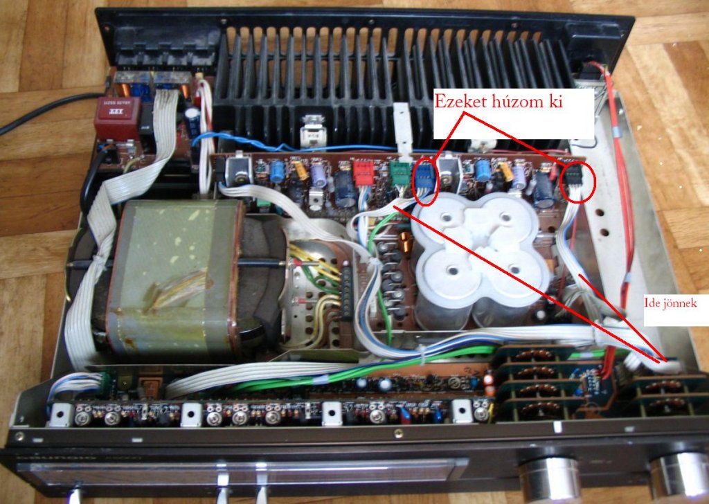 Van egy Grundig A5000 típusú erősítőm, aminek kint volt a tápfesze a kimeneten. Részben sikerült ezt megoldanom az egyik végtranzisztor cseréjével. Ha a képen látható panelt kiveszem, akkor kialszik a trafó primerével sorba kötött izzó és nincs DC a kimeneten. Ha berakom a panelt, és rádugom az összes kábelt, akkor világít az izzó és a védelem reléi nem húznak be. Ha a rossz oldalról lehúzom a két kábelt (képen) akkor majdnem teljesen kialszik az izzó, a védelem relék meghúznak és az jó oldal szól is. Sajnos kapcsolási rajzom nincs hozzá, de ha jól nézem az a két kábel a teljesítményszabályzó résztől jön (ez egy három állású kapcsoló 30, 60, és 120W állásokkal). Találkozott már valaki ilyen hibával? Esetleg tudjátok, hogy ez a teljesítményszabályozás hogy működik? Mert szerintem ott lesz valami hiba.