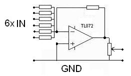 6 egyforma ellenállás, az közösítve egy műveleti erősítő IC-re (azon beállítani az erősítés nagyságát, ill. hogy ne is erősítsen) és a végére egy poti!