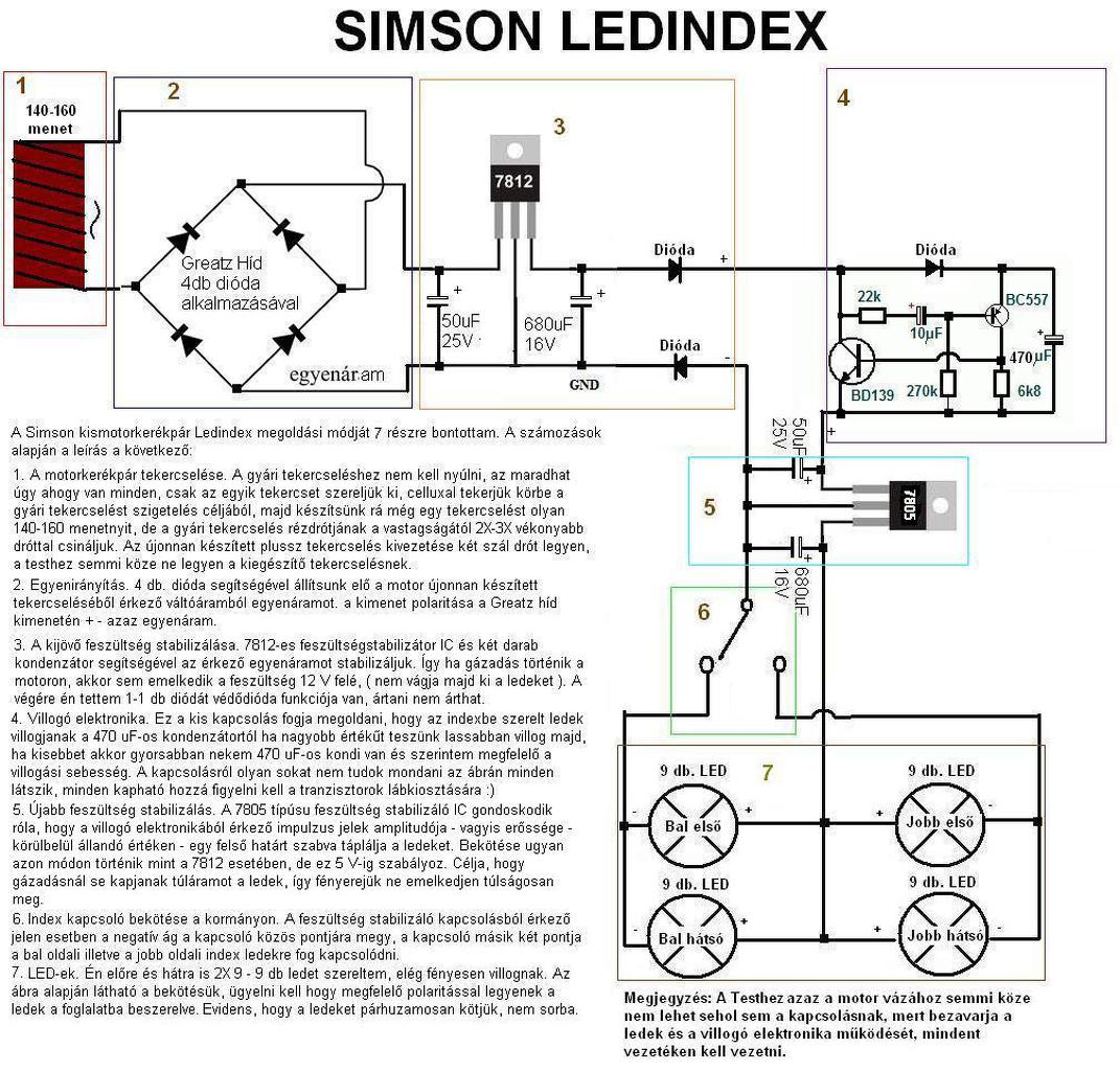 Akku nélkül motorkerékpárba tökéletesen működő LED-es index kapcsolási rajz! Garantálom hogy tökéletesen működik, megépítettem!