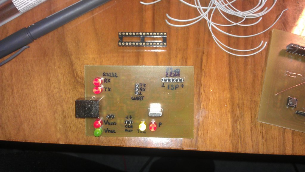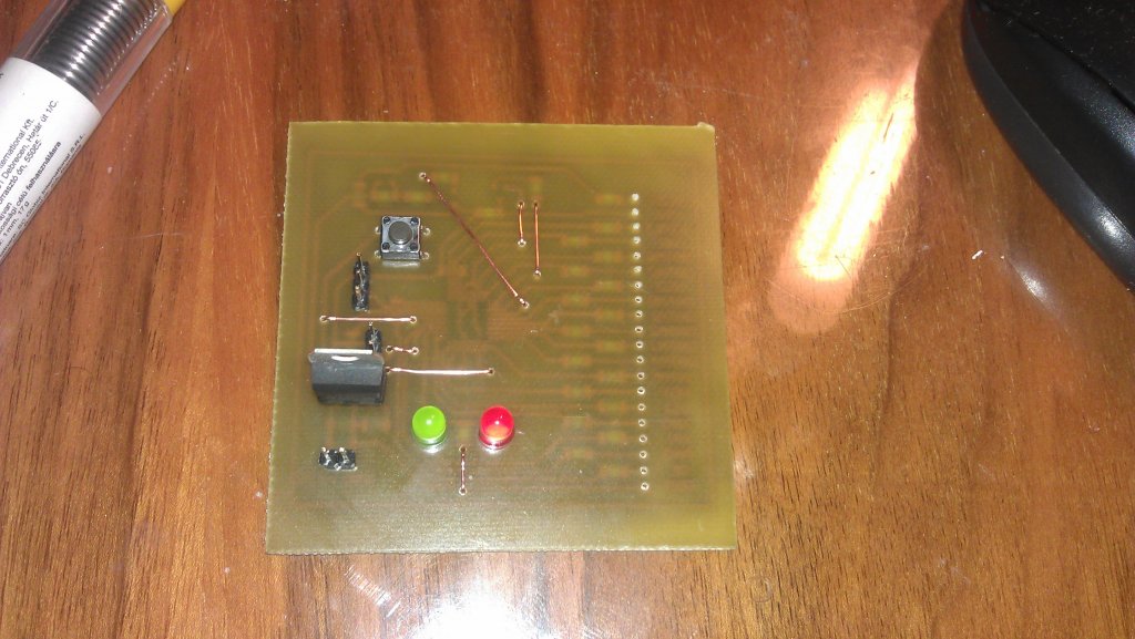 Mindössze kiegészítettem egy 74HCT125-el leválasztásképp és egy 74HCT08-al közösítem az UART interface-t. Így ha már van FTDI benne akkor lehet használni a géppel való kommunikációra is. Az a 2 vezeték most áthidal mert nincs itthon 7408-am. De ez már részletkérdés. Ezzel a programozóval fektettem meg a most helyrehozni kívánt atmega8-amat. (előfordul) Ennek a programozónak tegnap délután készült a terve (SCH&PCB 3x kezdtem újra mert nem tetszett ) és éjszaka folyt a beültetés. Letöltöttem a forráskódot, beleírtam a 74125 kezelését és még pluszba egy led kezelést ami pilácsol ha belépett programozó módba.