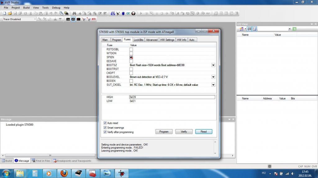 Tápot adtam a fuse-nak és már egyből zölden világított. Ha nincs benne a mega8 akkor piros. Még azért nyomtam neki gombot is, és az ISP programozó csak ISP freki problémát ír. Van valami ötleted hogyan tovább?