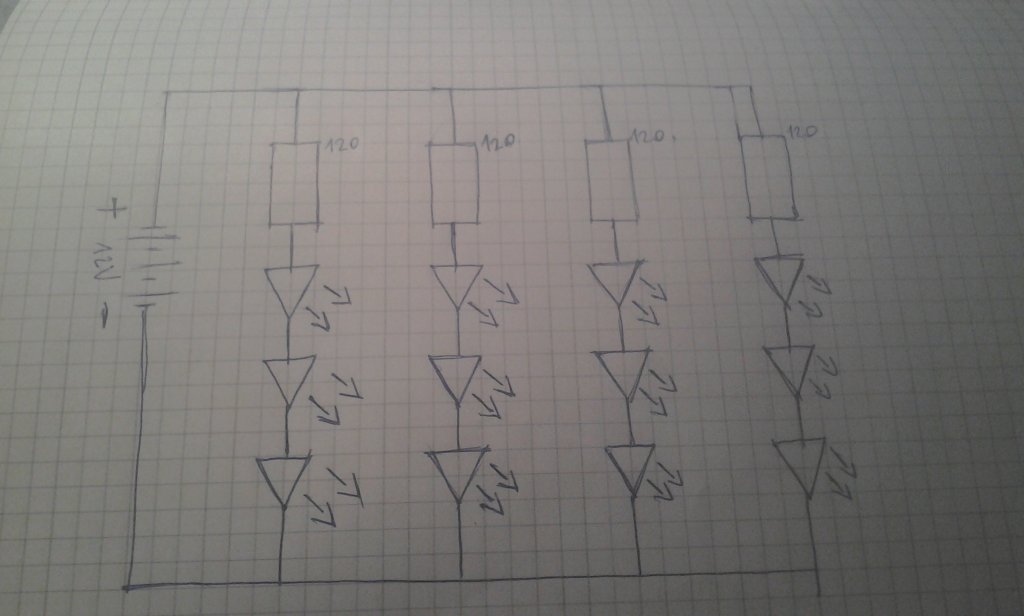 Ugyanúgy kell kötnöd őket a vezetékekre, tehát a kis csoportokat párhuzamosan. Ilyen módon, csak természetesen az általad kiszámolt ellenállás-értékkel. PC tápra jó sok ilyen "ágat" ráköthetsz.