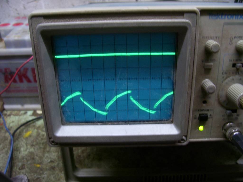 A mérés menete: Rákötöttem az akkut. Megindult a gerjesztőáram, 1,9-2A. Bekapcsoltam a motort. Elkezdte tölteni az akkut 7 A-rel, majd kis idő után lecsökkent 2-ig. 13,6 V. Bekapcsoltam a műterhelést, ekkor felugrott az áram 9 A-re, majd rövid melegedés után megállapodott 8,5-8,6 A körül (g06.jpg). Tartja a 13,6 V-ot. Az árammérés a g05-ön látható 50 A 50 mV-os minisönttel történt (azt hittem, ki tudom használni). A szkópon beállítottam a két csatornát azonos feszültségre és azonos pozícióba. Többszöri ellenőrzés után az eredmény a g4 és g5 képeken látható. Először a csillagponton testhez képest mérhető jel, majd a kimenő töltőfeszültség is. A diódákkal sorbakötött ellenállásokon a legkisebb állásban sem lehetett semmit látni a szkóppal, műszerrel sem lehetett érzékelni. Nyitott véggel 2,3-2,7 V közötti feszültséget lehetett mérni, amiből terhelve még mikroamper se lett. Nagyon szívesen mértem és fényképezgettem volna még, de nem volt mit.