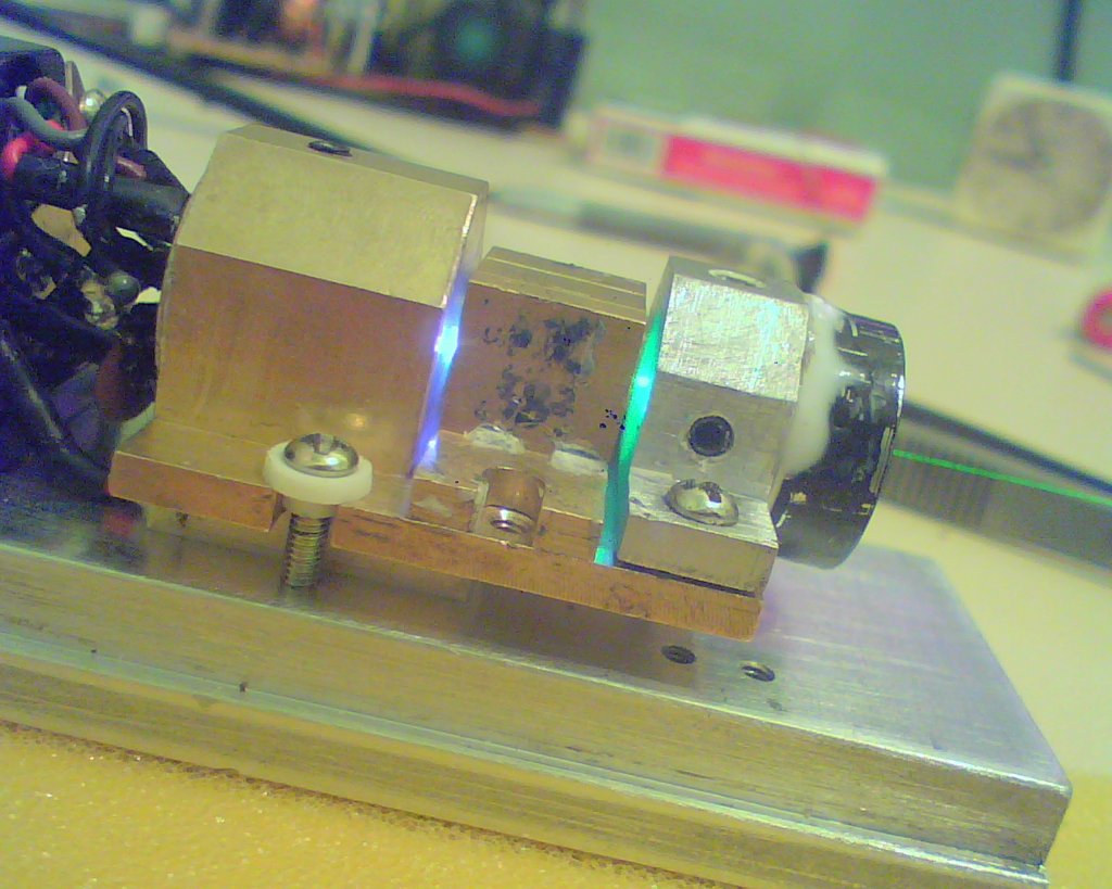 Nem volt egyszerű a beállitás,rengeteg órám ment rá és még igy sem biztos,hogy a max közeli 532nm-t generálja a kristály.Nagyon nagyon érzékeny az egytengelyűségre,a század milliméteres eltérésekre. A hőfokot stabilizáltam először 22-25 C°-ra,ez a dióda közelében volt,a KTP-nek nincs hőfok szabályzása,ez hül-melegszik a bepumpált infra függvényében,ennek hatása néha látszik is,kissé ingadozik a kimenő teljesitmény. Meglepetésemre,a KTP után közvetlenül nem jött ki semmiféle zöld fény,csupán az infra és a felpumpált 1064nm "fény". Tartozik az optikai részhez egy lencse,ami valami bevonatot tartalmaz,enyhén lilás-vöröses szinű,csak ezzel jött elő a nyers zöld sugár.Ennek beállitása nagyon kritikus volt,több órás idegöléssel tudtam csak megfelelő helyzetbe fixálni,ahol már gyönyörűszép kerek TEM00 lézerfolt volt a falon.A lehető legkisebb elmozdulása elmosódott,gyengült fényt eredményezett.Ezután már a kicsatoló lencsetag következett( expander és a kollimáló tagok)ami viszonylag egyszerű volt,csak a modullal való egytengelyűséget kellett fixálni,majd pedig a végén a sugár divergenciáját(menetes lencsetubussal) Lehetséges hogy többet is ki lehetne hozni belőle,nem tudom,a ragasztó már megszáradt,egyenlőre nem bántom,nagyon fényes a sugár,jelenleg 2,5A-on működik az infra(3W 808nm c tipus)
