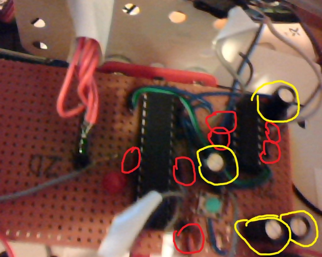 Az AVR bemeneti lábain fototranisztor van, de ez sem okozhat gondot, mert már úgy is próbáltam, hogy le voltak választva.Szűrés van (kép): a sárga 100nF, a piros karika 100 ľF.