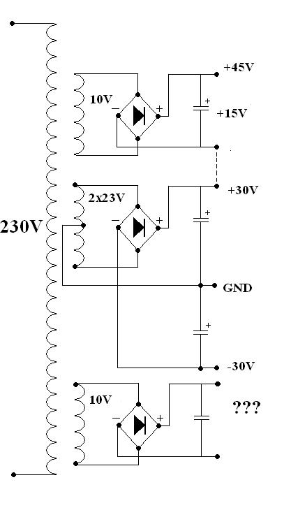 Sziasztok. Egy Darlington tranzisztorokkal működtetett végfokot akarok csinálni, amihez +-45V-ra lenne szükségem. Van egy 2x23V-os, illetve egy 10+10V os transzformátorom. Mivel nincs kedvem tekercselni, gondolkoztam, hogy ezekkel oldom meg, hogy külön egyenirányítom őket, majd sorbakötöm, így elhagyom az 50-60V-os puffer kondikat is. Mellékeltem egy ábrát az elképzelésemről, de nem tudom, hogy a táp negatív oldalához hogyan kössem hozzá az egyik 10V-os tekercsről érkező egyenfeszültséget. Ebben szeretnék segítséget kérni.