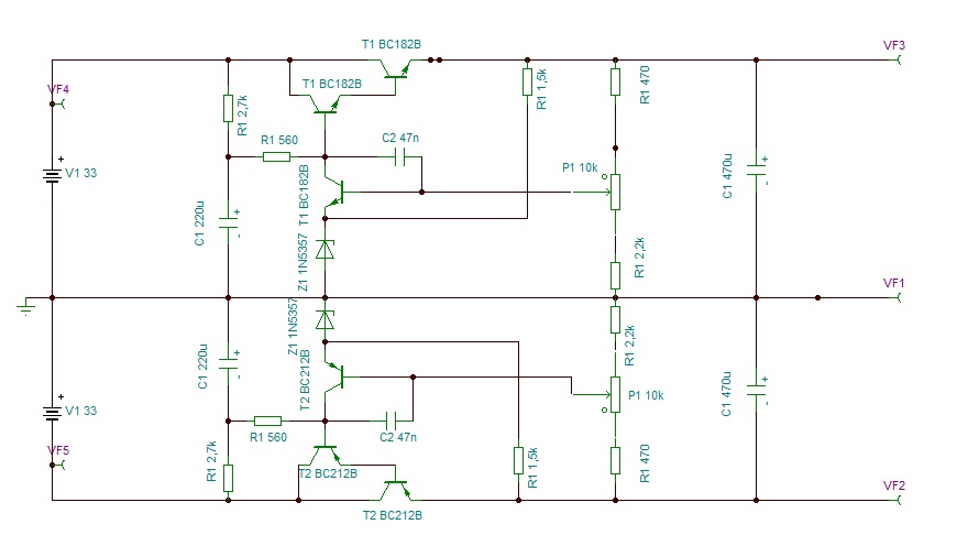 Sziasztok! A osztályú erősítőhöz lenne szükségem dual feszültség stabilizátorra. Gyorsan összeraktam egyet és mellékeltem a képet. 32-33V-ból kell 24V durván 1,5A nyugalmi áram mellet. Szelepnek egy BD243/244 tranzisztort gondoltam. Mekkora zener dióda lenne optimális? Vélemények? Javaslatok? Esetleg a kimenetre van szükség elkón kívül más kondira esetleg helyette más?
