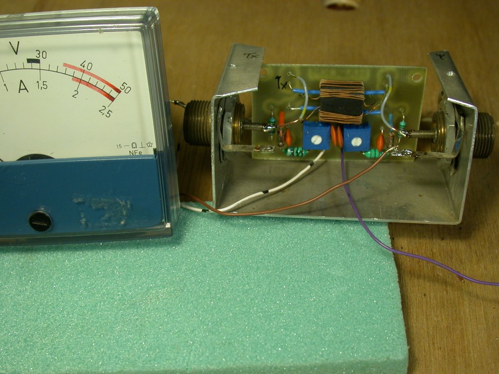 A provizórikus bedobozolás kinézete. A műszer helyére egyelőre 2 db. magnó VU-métert teszek holnap ha idő engedi. Egyet már látok, hogy talán korrektebb ha két külön ferrit gyűrűt alkalmazunk és rövid 4-6cm-es vékony koax darabot vezetünk át mint Primer, a harisnyát meg testeljük.