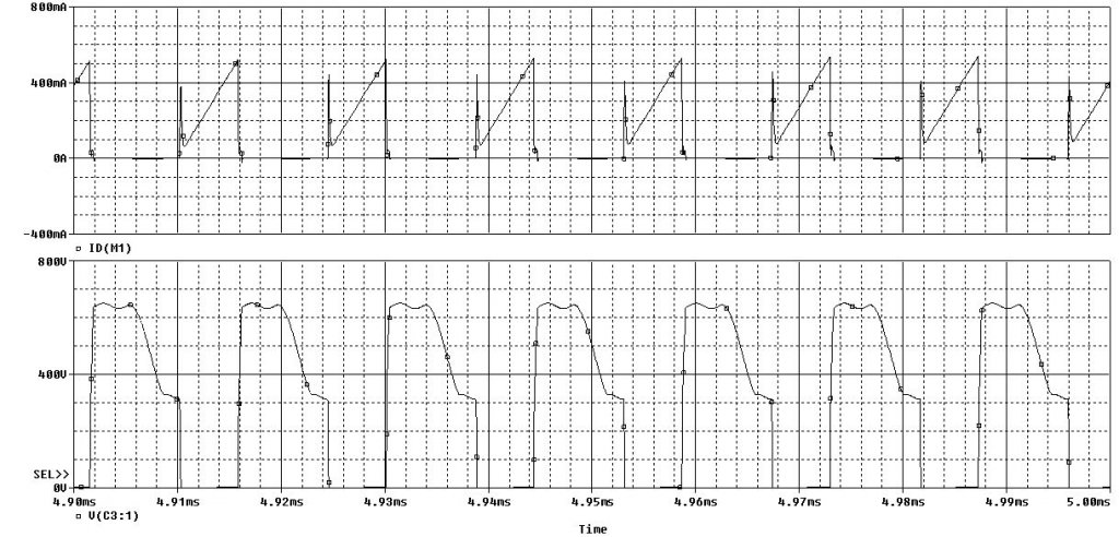 Na ezt elfelejtettem közölni.. eltérő menetszámokkal szimuláltam (szóval az előbb rosszul írtam, mivel valószínű, hogy a gyári trafóban egyformák a menetszámok.. igazából nem mértem ki azt a gyári trafót, csak hasraütőttem.. rosszul ), ugyanis én nagyobbra vettem a reset tekercset, mivel max. 40% kitöltéssel dolgozok, abban a hitben tettem ezt, hogy így hátha kisebbek lesznek a fetet igénybevevő feszültségek (ami a szkóp ábráimon látszik is, hogy így van, azonban jelen esetben feleslegesen, mivel 900V-os a FET. Egyforma primer és reset menetszámmal már 30uH esetén is barátságosabb a helyzet.. még egy ok a trafó újratekerésére.. és még egy tapasztalat.. [OFF] és még egy magyarázat, tervezési szempont a leendő cikkbe.. ezért mondtam, hogy ameddig nem vagyok a dolgok nagyonnagy részével tisztában, nem merek belefogni irományba..