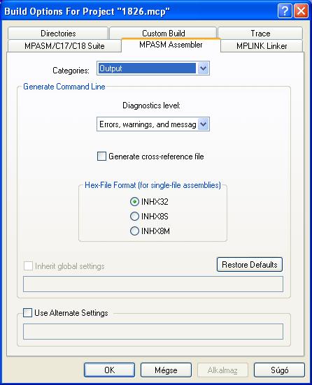 Project / Build options / Project menüben az MPASM Assembler fülön az Output beállítások között INHX32 -t kell kiválasztani.