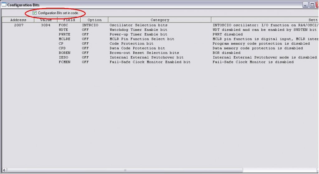 Az MPLAB Configure/Configuration Bits menüpontban be van pipálva a check box, hogy Configuration set in code?