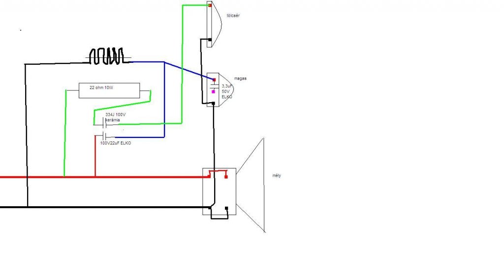 A mély hangszóró 250W-os mnc 8ohmos 2 tekercses. Csináltam egy rajzot hogy most mi van benne. Ez gyári kapcsolás. Kelelne egy két érték hogy a tekercset milyen induktivitásra tekerjem és hogy a kondi mekkroa legyen a mélynek.