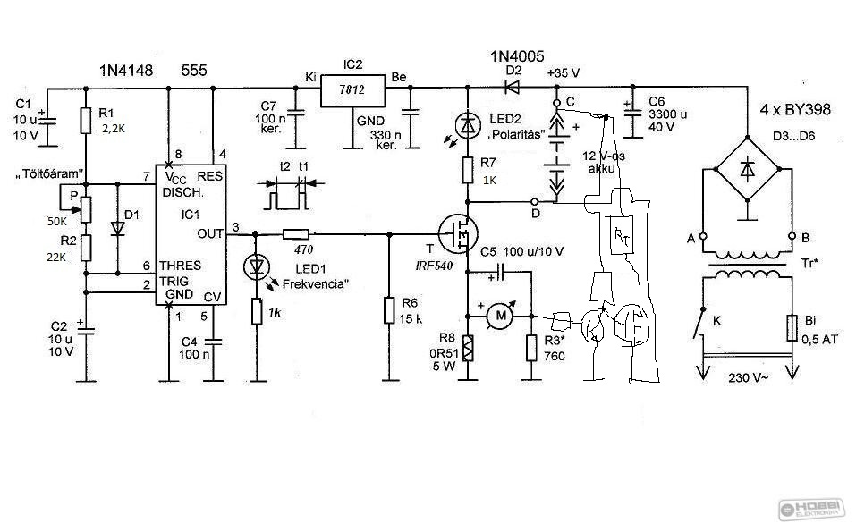 Az eddig vázolt dolog mindössze 4 ponton kapcsolódik az eredeti kapcsoláshoz (akku + - kapcsai, 555 "7." "8." lába), annak működésébe egészen addig nem avatkozik bele, amíg az akkufesz átlagértéke kisebb a beállítottnál.