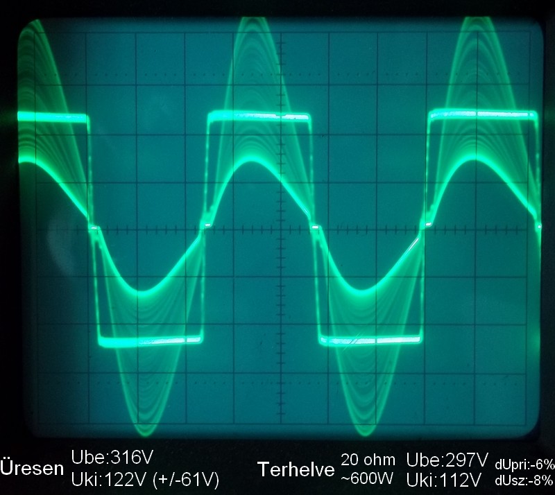 Az áramforma nem éppen szinuszos, viszont nagyon jól terhelhető maradt a táp, szemben azokkal a félhidakkal amik nagy szórású trafóval készültek. Illetve láttam olyan megoldásokat ahol a rezonáns kondi nem sorosan, hanem párhuzamosan van a trafóval.
