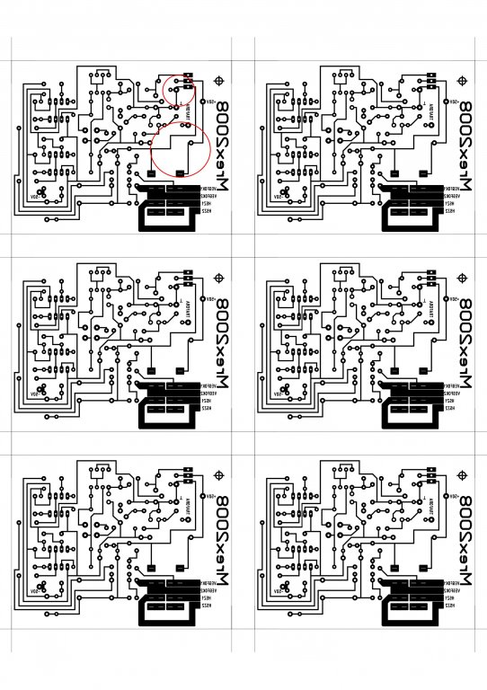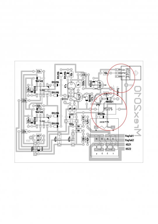 Meg lett a hiba a vasaláshoz kapott nyákon volt rossz helyre húzva 3 vezetősáv amiket átvágva és megfelelően az adott pontokat vezetékkel átkötve helyre is állt a kütyü, mellékelem a beültetési és a vasaláshoz való nyákot is mindkettőn bekarikáztam azon részeket amik okozták a galibát, a beültetési rajz a jó.