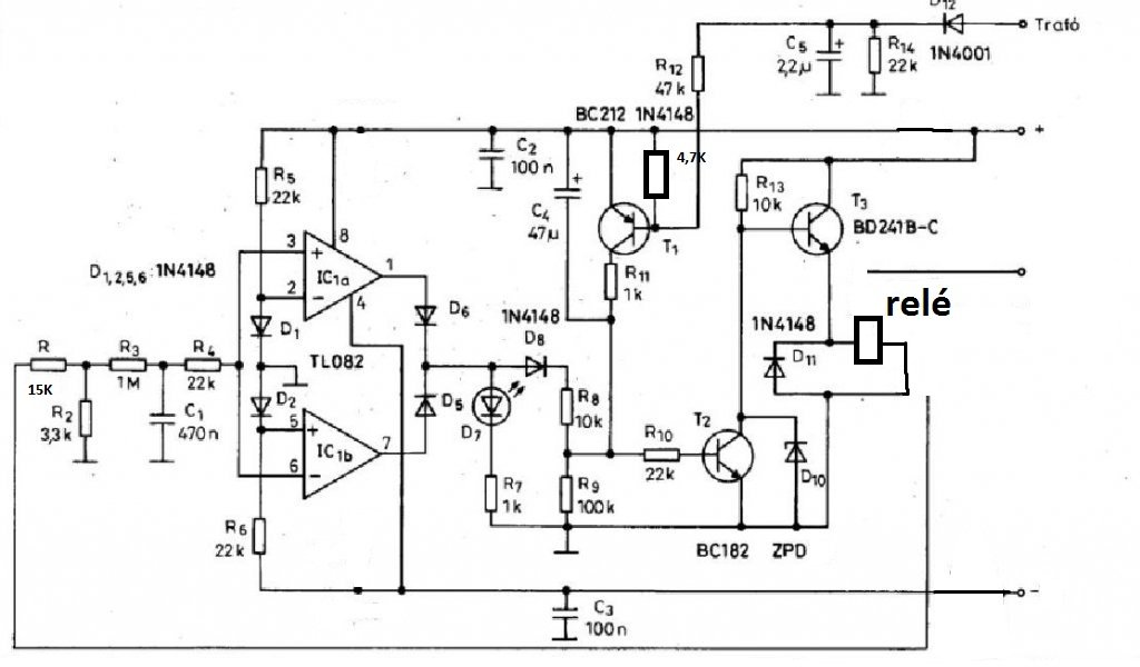 Üdv mindenkinek mrex kollégától kaptam ezt a kapcsolást épülő VF2-höz, megépítettem de sajna nem akarja az igazat, nincs meg a késleltetés bekapcsolás után azonnal húz a relé és ellövi a BD241-et, amit változtattam az eredeti kacsoláshoz képest a TL082 helyett RC4559 került bele valamint a két 3k3 helyett 3k9 került bele, BC-s tranyók cserélve Zéner cserélve helyzet ugyan az, a relére 62 volt kerül ki, kérem a segedelmet mert elakadtam.