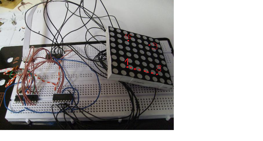 Megépítettem ezt a kapcsolást (a jobb oldalon található) de sajnos nem jól működik. A kijelző ez a típus. Úgy kötöttem be, hogy ha a felirat (LM-88G23-CC) felém néz akkor a lábkiosztás - mint az IC-knél - bal alsó az egyes láb.( a képen bejelöltem) Ezen a videón látszik, hogy nagyon halványan világít és össze-vissza villognak a ledek. Csak teljes sötétben látszanak. A proton basic programot hibátlanul fordította hex-be a fordító de nem tudom, hogy jó-e a program. Szeretném a segítségeteket kérni.