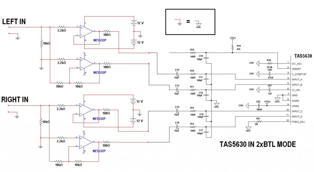 Ha jól értelmezem, a TAS5630-nál a differential-input BTL módnál azt jelenti, hogy az egyik félhíd ellentétes fázisú jelet kell, hogy kapjon. Ezért gondolom, hogy kell egy ilyen fázisfordító kapcsolás a bemenetekhez.