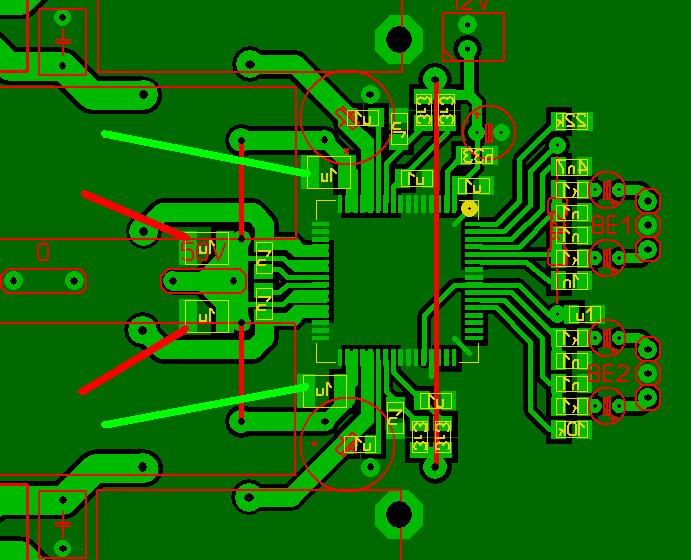 Kép1: Az "1u" kondik a PVDD_x és GND között: a PVDD_A és D esetén közvetlen a pin után vannak. Az 50V a kondik után csatlakozik, míg a PVDD_B és C lábak után nincs ott közvetlenül ez az "1u" kondi, hanem először közösítve van B és C, megkapja az 50V-ot és csak ez után van kondi. Ezáltal a B és C mennyire "független" egymástól, merthogy ezeket a kondikat közvetlen a pin-ek után kellene elhelyezni, legalábbis a leírás szerint ilyen nagyfrekis izolátorok.