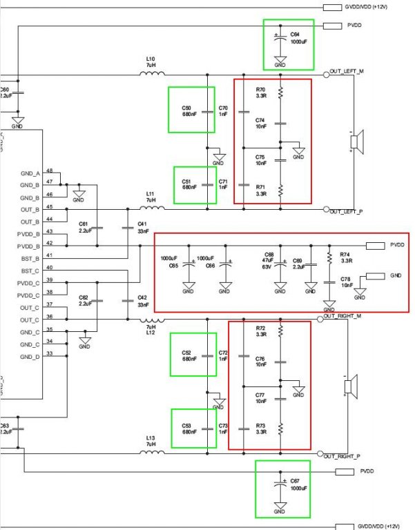 Én LC szűrőre 14uH-t és 1µF-t használtam, szeretem ha több a szűrés. A zobel-network csak akkor ajánlatos ha >10m hangszórókábelek várhatóak. Az 1-1nF kondik pedig szintén hasonló okból vannak mint a tápnál, de általában ezek is felesleges, ha csak nem valami ultraszigorú EMI tesztre gyűrsz.