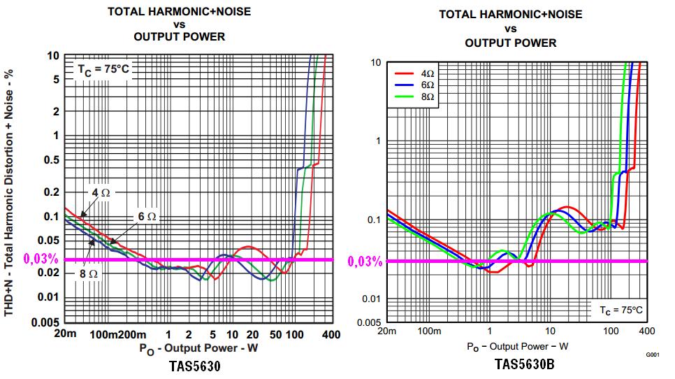 De sokkal érdekesebb, a THD+N grafikon. Mellékeltem egy összehasonlító ábrát, a TAS5630B sokkal gyengébb paraméterekkel rendelkezik. Nem, tudom miért változtattak az eredetin negatív irányban a B verzió kifejlesztése során, mindenesetre a torzítás leginkább 0,1% körül van, persze arra ügyeltek, hogy 1W-nál minden okés legyen 0,03%, de felette megiramodik rendesen.