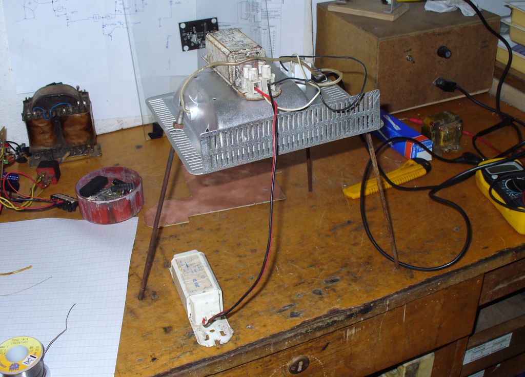 A hozzá tartozó kerettörténet: A mai nap átlagosan indult.... Volt egy nyákterv, le kellett volna fotózni. Levágom méretre a nyákot, felkészülök, összeszerelem a HMLI-s asztalilámpás levilágítóm... Bekapcsolom... Várom hogy melegedjen be, miközben azon gondolkoztam hogy vajon miért írják rá a HMLI dobozára hogy csak függőlegesen lefelé lógatott helyzetben használható. Ezen állítás helyességének megállapítására elkezdem az asztalilámpám fejét forgatni, amikor majdnem függőlegesen felfelé áll az izzó, egy nagy lila villanás, csattanás, és elment az áram... Igazuk volt. Elszakadt az előtét izzószál a búrában, még ismeretlen okból .Ekkor elővettem ezt a félig elkezdett levlágítómat és gondoltam hogy ma befejezem. Beleraktam az Örült Ödön féle HgOK125-ös kvarclámpát, de nem volt persze előtétem hozzá. 160W-nyi soros izzó se volt jó neki, nem akart megfelelően világítani. Végül egy 20w-os és egy 40W-os fénycső előtétet párhuzamosan kötve, adta a megfelelő előtétet. Így beállt az üzemi 90-100V. Holnap kikísérletezem hogy mennyi ideig kell megvilágítani a nyákot, és végre elkészíthetem a nyákomat amit ma akartam.... Arra is rájöttem hogy forrasztani jobban tudok mint hegeszteni.... a 3 lábat 1-1 csavar fejére hegesztett fémpálca alkotja Íme 2 kép. (Egy keletnémet kvarclámpa van megmódosítva) Igen... még dolgozni kell a megfelelően érintésvédett végleges verzión (ez gyakorlatilag megint egy elrettentő példa tőlem, hasonlóan a tavaszi légszerelt csöves oszcilloszkóphoz....)