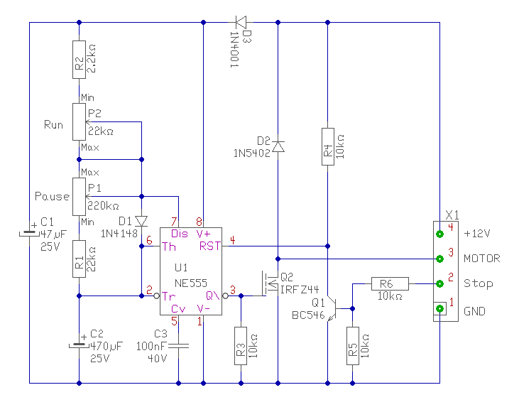 Megrajzoltam amit kértél, ha megfelelő, használd egészséggel. (Max 2 perc körüli amit el lehet érni, nullától pedig nem időzítünk, mert nulla idő alatt sem feltölteni, sem kisütni nem lehet egy kondit.) Van benne egy tiltás is, ha nem kell, nem használod. Motort a +12V és az M kimenet közé kell kötni. üdv! proli007