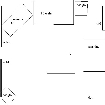 A képen látható módon van elrendezve a szobám(elég kicsi) (felülnézet), ami tetőteres nagyon összevissza van a teteje/oldala. Azt vettem észre hogy ahány helyen hallgatom a zenét annyiféle képpen szól a hifim (elég nagy hangfal, 3 utas, bass reflex) Az ágyan fekve vannak a legjobb mélyhangok, szinte gyomorba rúg, a szoba közepén ezek a mélyek szinte sehol sincsenek, viszont gyönyörű közép és magashangok, a szoba hátulja felé kezdenek megint megjelenni kicsit a mélyek. Hogy kéne elrendezni a legjobb hangzásért?