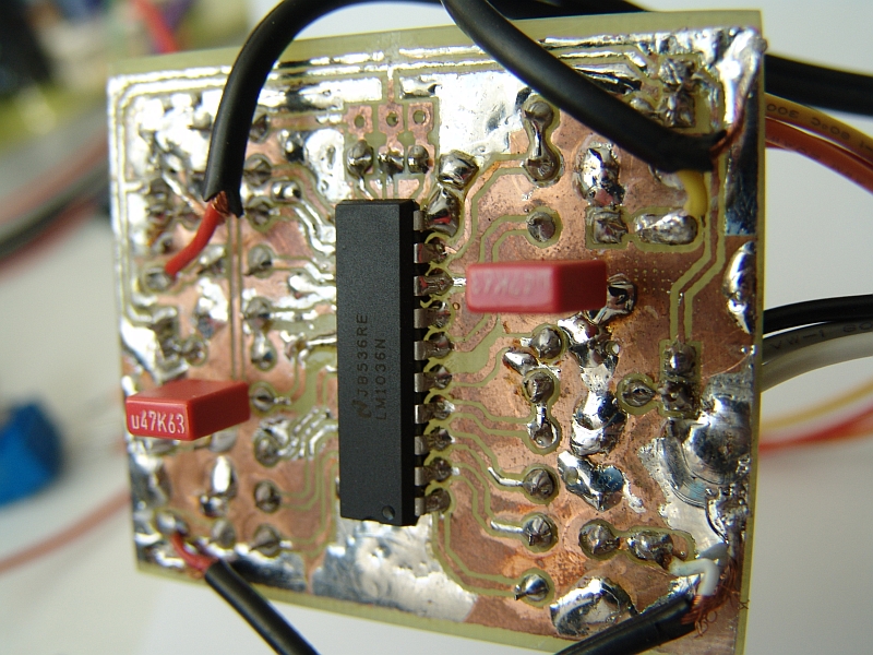 Megépítettem ezt a hangszínt, őszintén elégedett vagyok vele, hangminőségben semmilyen kigogásolhatót nem tapasztaltam, magas-mély nagyon jó, a balansz is szépen szuperál. Egyedül a loudness-nél nem tapasztaltam komolyabb változást, a hangerőállítás ilyenkor nekem is kiiktatódott. Néhány gondolatot hozzáfűznék még. Az eredetileg 390 nF-es 'mély' kondikat nagyobbra cseréltem (470) mert kevésnek találtam a basszust amit produkált, potiknál az érték elhanyagolható (nekem 1k-sak kerültek bele és nem találtam különbséget az eredeti értékűekkel próbálva) és a gerjedések elkerülésére stabil táp, 9-12V tápfesz és persze fémdoboz. Két képet felteszek a panelról, reméltem tudtam valamit segíteni.