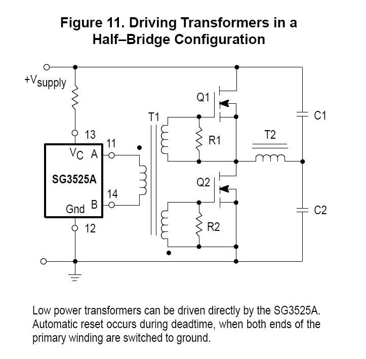 Következő kérdés az lenne, hogy mi lenne, ha nem a TL494-est használnám, hanem az SG3525-öt? Abban van nyitó, és lehúzó tranyó is. Elvileg 0.5A-es. Akkor meg lehetne spórolni a gate trafó meghajtó tranyóit is.