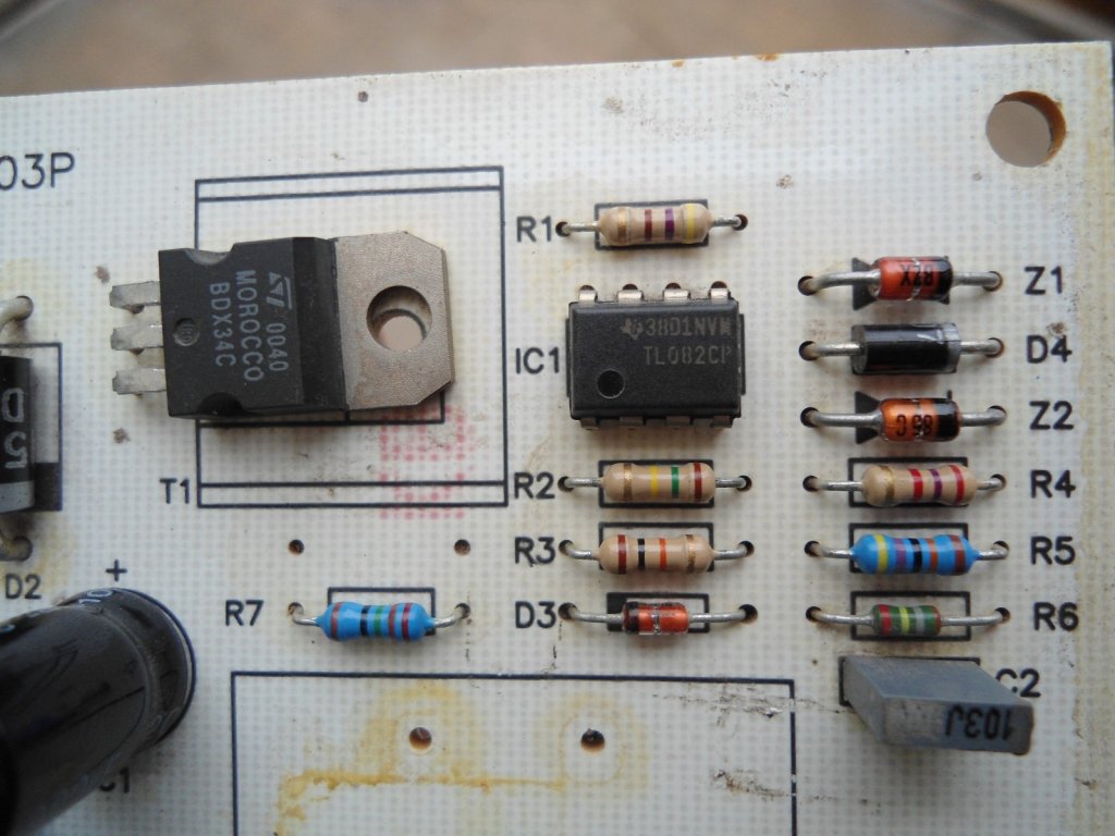 A relé tekercse 24V-os, keress rá a típusára SZ-S-124L: Bővebben: Link. A TL082 adatlapjában pedig +-15V-os tápfeszültségérték szerepel, ezek alapján valószínű, hogy a trafó 24V-os lehetett. A kártyán látható elektrolit kondi kicsit mintha hízna, én a biztonság kedvéért kicserélném, minimális költség.