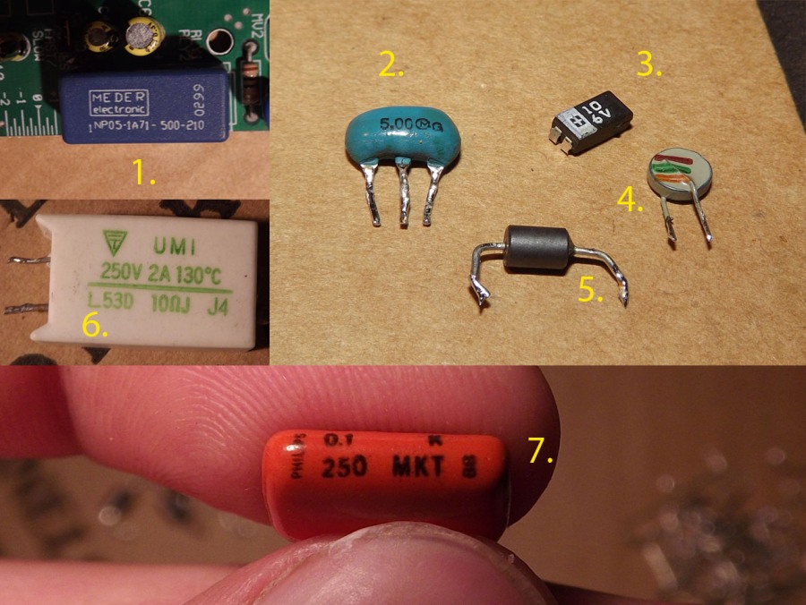 Találtam néhány alkatrészt, de fogalmam sincs, hogy mik ezek. A képen meg vannak számozva: 1. 4 lába van, szerintem relé, mert ez egy mozgásérzékelőben van, és amikor érzékeli a mozgást, hallok valami kattanást, és más mozgónak kinéző alkatrész nincs a közelben. 2. Régi billentyűzetben volt egy IC-re kötve, és a két szélső lábán volt egy ellenállás. 3. SMD, 3 lába van, kettő elöl, meg a harmadik hátul. Ez szerintem tranzisztor, de akkor miért van rajta a + jel? 4. Hirtelen kondenzátorra tippeltem, csak az a három színes csík van rajta. 5. Nincs rajta semmi. 6. Biztosíték, vagy ellenállás. Mert van ellenállása, de miért lehet ott, hogy 250 V, 2 A ? 7. Szerintem kondenzátor. Ha az, akkor gondolom, 0,1 µF-os, és max. 250 volt. És két lába van. Előre is köszönöm, ha valaki tud segíteni.