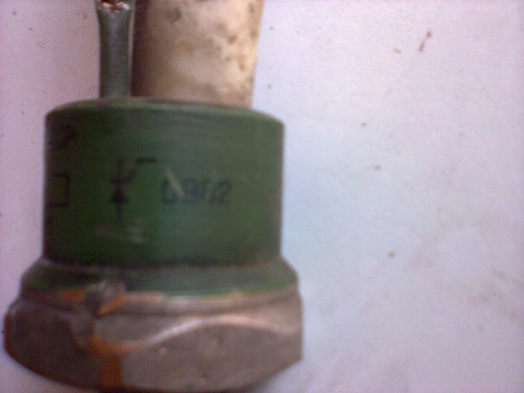 Nem lehet látni sajnos a feliratokat rajta, de ez egy szép nagy orosz teljesítménytirisztor. A fémház az anód, a vastag hosszú vezeték a katód, a kicsi kivezetés a vezérlőelektród.