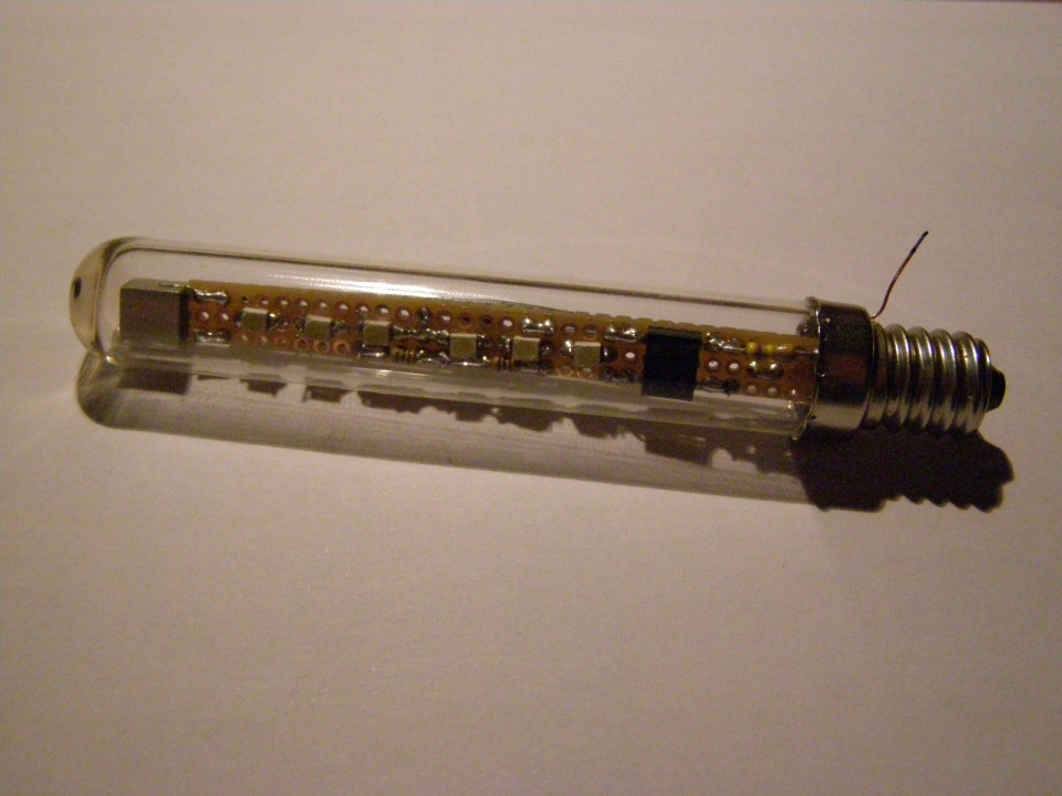 Apró SMD LED-ek és a hozzá való "kínai elektronika" módszer 220 V-os üzemre. A menetes fémrész egy rossz E14-es izzóé volt, az üvegbúra pedig kémcsőből van. A beleépített önhordó panel alkatrészboltokban készen kapható furatos hobbypanel.