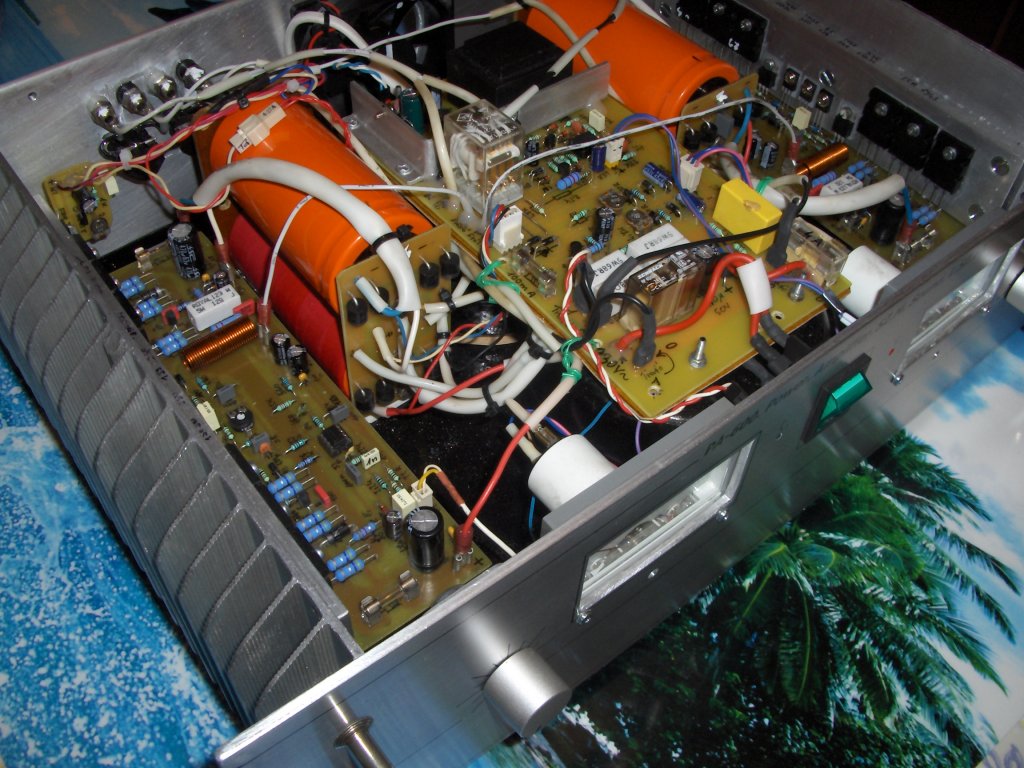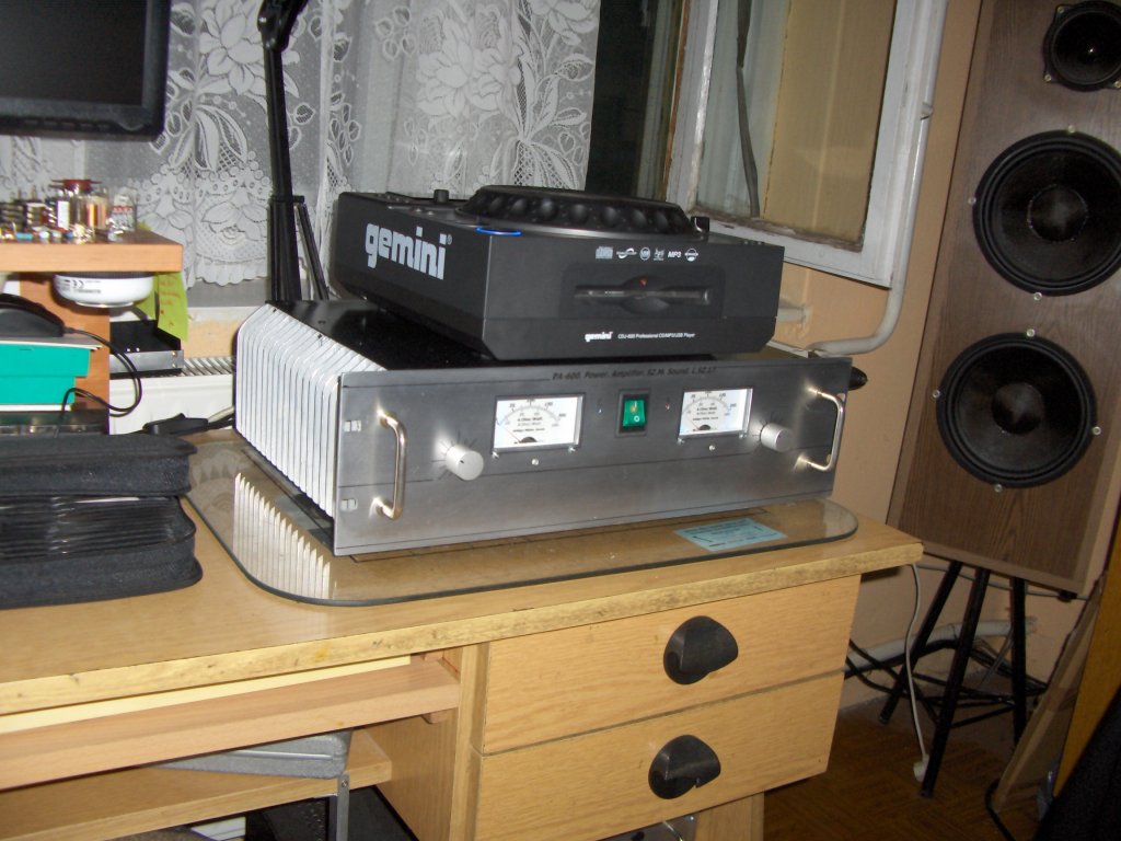 Sziasztok, elkészült az új PA-300,am és ahogy ígértem teszek fel róla egy pár képet. Az igaz, hogy nem igazán úgy sikerült mint, ahogy szerettem volna, mert a drága puffer kondik miatt csak a jóval nagyobb méretű bontott kondikat kellet bele préselnem a dobozba. Az agyon árnyékolt BEAG trafók húztak ki a sárból és a nagy kondik hátra tolása a dobozba, hogy a gerjedéseket el kerüljem szerencsére még elég távol tudtam tenni a 230V,ot is a be és ki menettől Tegnap meg voltak a bemérések. A trafókat 11db,ból válogattam ezek 42V váltót adtak le terheletlenül ezt egyen irányítva és szűrve kaptam +-58V,tot a nyugalmi áramot 100mA, állítottam 20 perc üres járás után ezután el vittem a barátomhoz, hogy oszciloszkópon és mű terhelésen meg mutassa a kicsike mit tud. A mérést 4.Ohm,mos műterhelésen végeztük 1kHz,10kHz,és 15kHz, frekvencián 243W,ig torzítatlan maradt ezután a tápfeszültség esése miatt némi változás volt látható a négyszög jelen. Az idő rövidsége miatt több mérést nem volt módomban elvégezni. Ma reggel 7óra óta nyúzom míg a nejem haza nem jön olyan 14 óra feléig eddig rendben működik és nagyon szép hangja van. Lehet, hogy majd magamnak is meg építem egy kicsit combosabb trafóval.?!