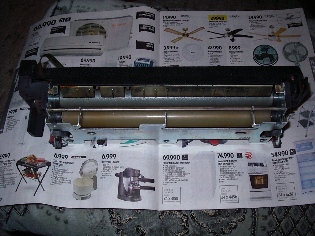 "égetőművét" a felső fémhenger fűtött (és a sok használattól ráégett toner durva smirglivel lecsiszolva Ha a papír a gumihenger felé van akkor nincs ideje annyira átmelegedni hogy rá is tapadjon a toner a nyákra ! Mindíg a fűtött felület legyen a a papír,és a réz felől (tehát a nyák rezes oldala néz az "ég felé"