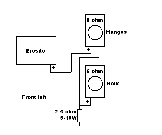 A halkítás mértékét neked kell elbírálni. Javaslom szerezz be 2db 10ohm-os ellenállást. A másodikat kötheted az elsővel sorban, vagy párhuzamosan, illetve a halkabb hangsugárzóval párhuzamosan. Így 4 különböző érzékenységet tudsz előállítani, közülük kiválaszthatod a számodra legkedvezőbbet. Bővebben: Link