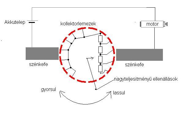 Az elképzelés csak annyiban hibás, hogy az egyenáramú motorok fordulatszám szabályzása előtét ellenállással nagyon rossz jelleggörbét eredményez. A motorok fordulatszámát a kapocsfeszültségük változtatásával lehet szabályozni, de ha ezt előtét ellenállással tesszük, akkor a terhelés miatti áramváltozás is feszültség változást eredményez, ami rontja a motor fordulatszám, nyomaték görbéjét. A villamos hajtásban használt kontrollerek, nem előtét ellenállásokat kapcsoltak, hanem a gerjesztő, és armatúra tekercseket variálgatták. Ellenállást, csak mezőgyengítésre, illetve fékezésre használták, akkoriban más lehetőség nem lévén. Manapság az ilyen szabályzásokat elektronikusan oldják meg, ha visszább olvasol, láthatod. Pl. PWM. Vagy másfajta motor használata, háromfázisú motor használata változtatható frekvenciájú inverterről. Bár meglehet akkor is célszerű valamilyen hajtóműves motor használata a fordulatszám csökkentésére.