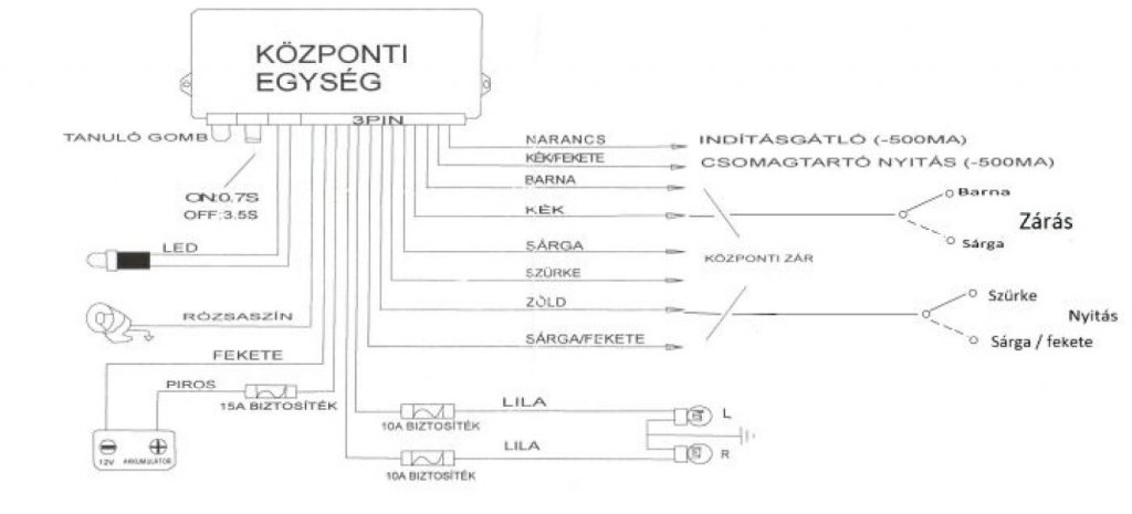 kék-fehér: ajtónyitó (neg) kék: motortér, csomagtér (neg) barna: gyújtástiltás lila: gyújtáskapcsoló szürke: negatív záróimpulzus kp zárhoz (max 150mA) narancs: negatív nyitóimpulzus kp zárhoz (max 150mA) fekete: test piros 3A, piros 15A: akku +12V sárga, sárga: irányjelzők Üdv Inhouse