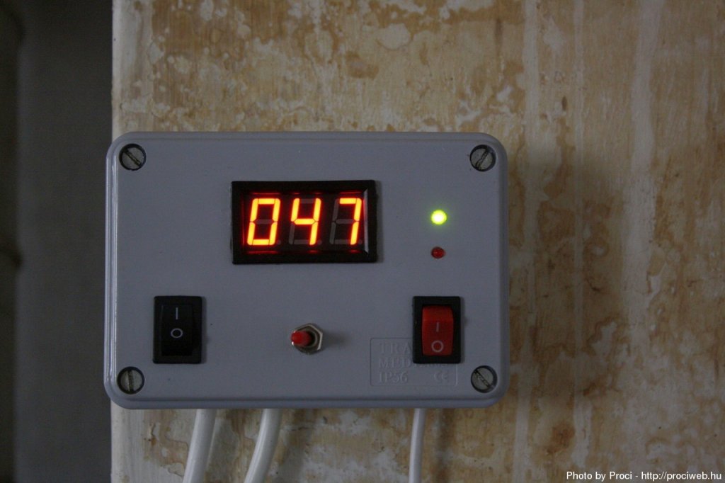 Bemutatnám az új büszkeségemet. Régi probléma a vegyes tüzelésű kazánunknál, hogy éjjel ki kell húzni amikor kialudt a tűz, lehűlt a víz. A kazán egy melléképületben van, tehát télen a hóban, fagyban kellemetlen éjfél-hajnal 2-kor. Működése a következő: Első kapcsoló betáp ON-OFF. A bejövő fázist bontja ami a relé C(közös) érintkezőjére megy és a 230/12V/3.5VA trafóra. Második kapcsoló balra kapcsolva automata üzemmód (65°C-nál relé be, 30°C-nál relé ki) Jobbra kapcsolva manuális üzemmód. Ekkor a piros LED figyelmeztet, és a 3. piros kapcsolóval lehet közvetlenül vezérelni a relét, függetlenül a hőfoktól. A relé állapotát a zöld LED minden esetben jelzi. A relé 2 áramkörös. A szivattyúra így a 0-t és a fázist is külön engedem rá a maximális biztonság miatt. A jobb szélső piros is a relét vezérli, 230V egyedül csak a bal feketére van kivezetve jól leszigetelve. A felhasznált TO-220 tokozású LM35DT (Bővebben: Link)hőérzékelőhöz 6x0.22-es árnyékolt riasztó kábelt használtam fel. A 3 vezeték (+, -, out) 2-2 szálon megy, és az árnyékolást a házban házzákötöttem a negatívhoz. A hőmérséklet szabályzó lelke a CA 3140 műveleti erősítő, ami T(!)Ohmos bemenettel rendelkezik. Ennek az egyik bemenetére kerül az LM35 hőmérséklet érzékelő kimeneti jele, mely 10mV/°C meredekségű. Ezt a kimenetet megcsapolva egy LM358-ból kialakított 10-es szorzóra is küldöm a jelet, ami a 600mV-ból 6V-ot készít és küldi a kijelzőre. A kijelzőről lecsíptem a dot (pont) szegmens lábat, így nem látszik, hogy 6.0, helyette 60, azaz 60°C. A betáp egy dugvilla, a relével vezérelt kimenet egy dugó aljzat, tehát 1:1-ben közbeiktatható a régi manuális rendszerhez + ha gond van, bármikor kiiktatható. (A be és ki 230V vezetéken lévő földelés összekötve.) Költségvetés: Kijelző: 1800 Ft Trafó: 1200 Ft Doboz: 600 Ft LM35DT: 635 Ft Panelek: 1000 Ft 230V-os dugvilla, aljzat: 2x400 Ft Kapcsolók: 400Ft Tehát ~6400 forintból kijött. Látszik, pár dolgon lehet spórolni, ha már ott lapul a fiókban. Köszönet "Csupasz" kollégának az LM358 10-es szorzó ötletért. + Kijelző ügyben bátran forduljatok hozzá. Ma volt az éles bevetés, jól vizsgázott a szerkezet. 1 dologra kell megoldást találni: 65°C-nál bekapcsol, házból kinyomja a hideg vizet ami lehűti a csövet majdnem 30°C-ig. Talán egy nagyobb kondit teszek a műveleti erősítő érzékelős lábára, hogy lomhább legyen, mert pár perc után már 40 °C-os lesz a víz, felesleges volna lekapcsolni a szivattyút.