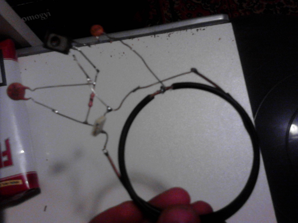 Szia! Ha jól látom a képen a tranyó bázis és kollektor köre fel van cserélve , avagy a bázis helyett a kollektorra kötötted az eredetileg bázisellenállásnak és visszacsatoló kondenzátornak szánt két elemet ( 15kohm / 470pF - 5.1kohm / 1nF). Meg kéne cserélni , tehát ezt az R-C párost a bázisra kéne kötnöd (szemből nézve a tranzisztort tehát nem a hőleadó felület felől hanem a felirat felől a kiosztás E-C-B így a jobb szélére kösd az R-C tagot ). Ajánlott fólia alapú kondenzátorral építeni (én vettem MKT kondikat de azzal nemvolt hajlandó menni , kicseréltem mindet styroflexre és mindjárt 8-10cm lett a hatótávom!). Tehát 4.7nF a tranzisztor középső lába és a tekercs egyik vége közé , majd 5.1k / 1nf a tranzisztor (szemből ) jobb szélső (hátulról pl.: ahogy a képeiden látszik ) bal szélső lába és arra a tekercs végre ahol a 4.7nF kapcsolódik a tekercsre. Remélem segítettem!